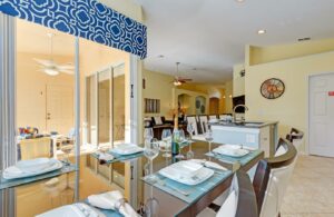 Dining room table adjacent to the kitchen for enjoying a sit down meal, this area has access to the Pool Deck though double patio doors.