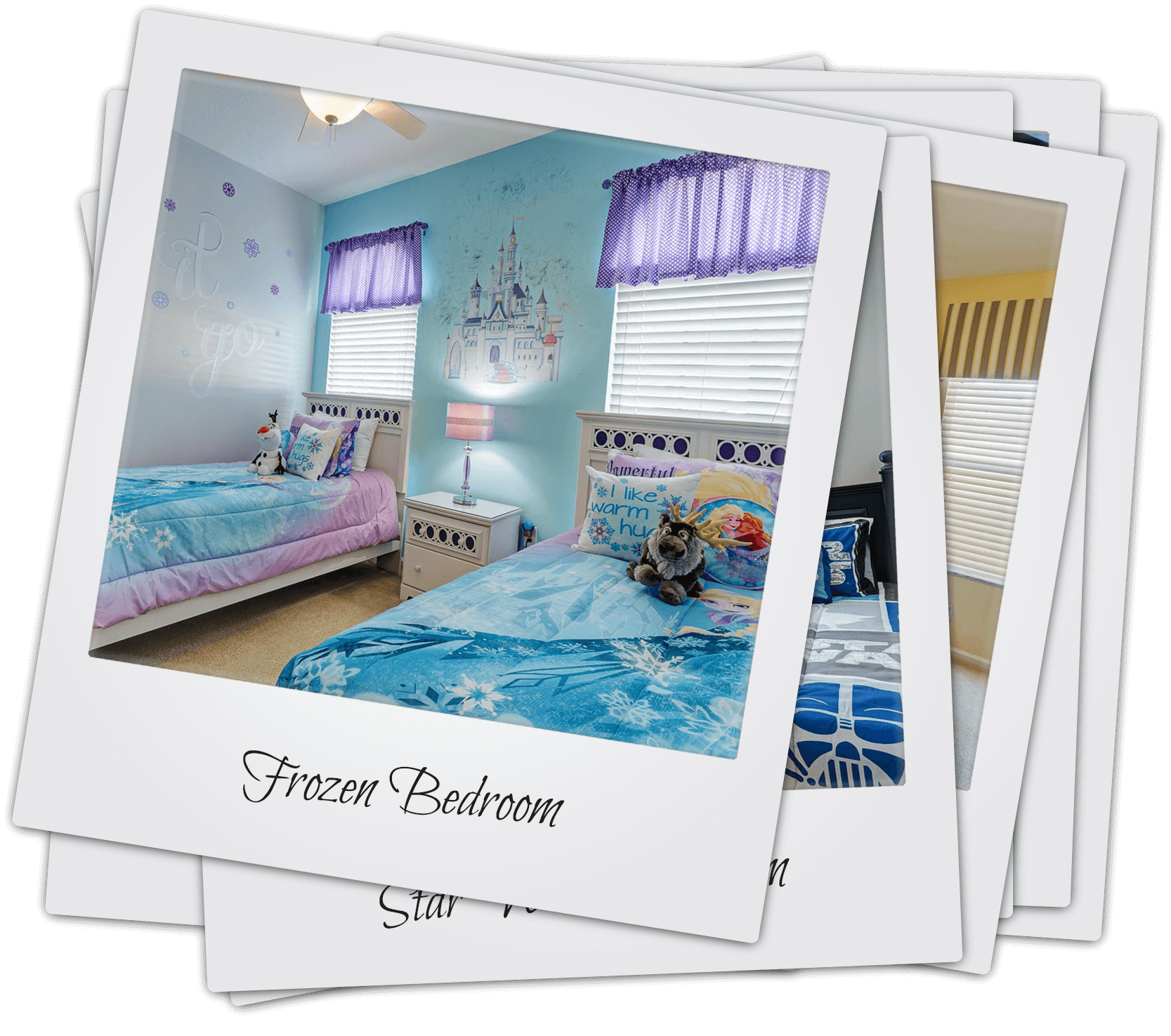 Find the land of Arendelle in the sunshine state in this Frozen themed room. Featuring two twin beds, complementing night stand and chest of drawers. The room has its own dedicated integral wardrobe and Flat screen Samsung Smart TV.